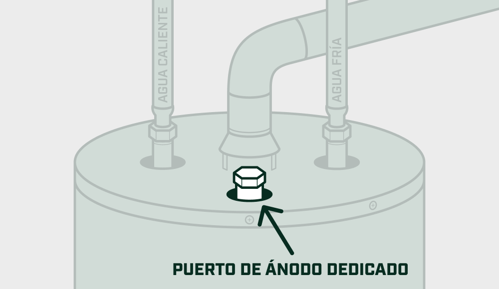 Ilustración que muestra dos ubicaciones comunes de ánodos en un calentador de agua: puerto dedicado y salida de agua caliente.